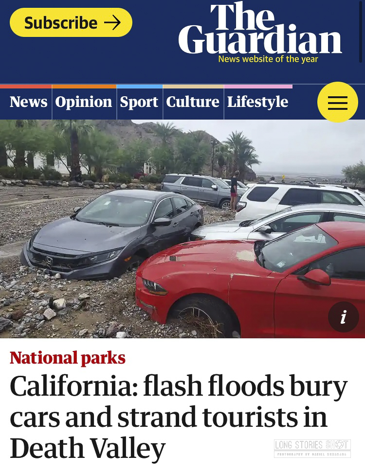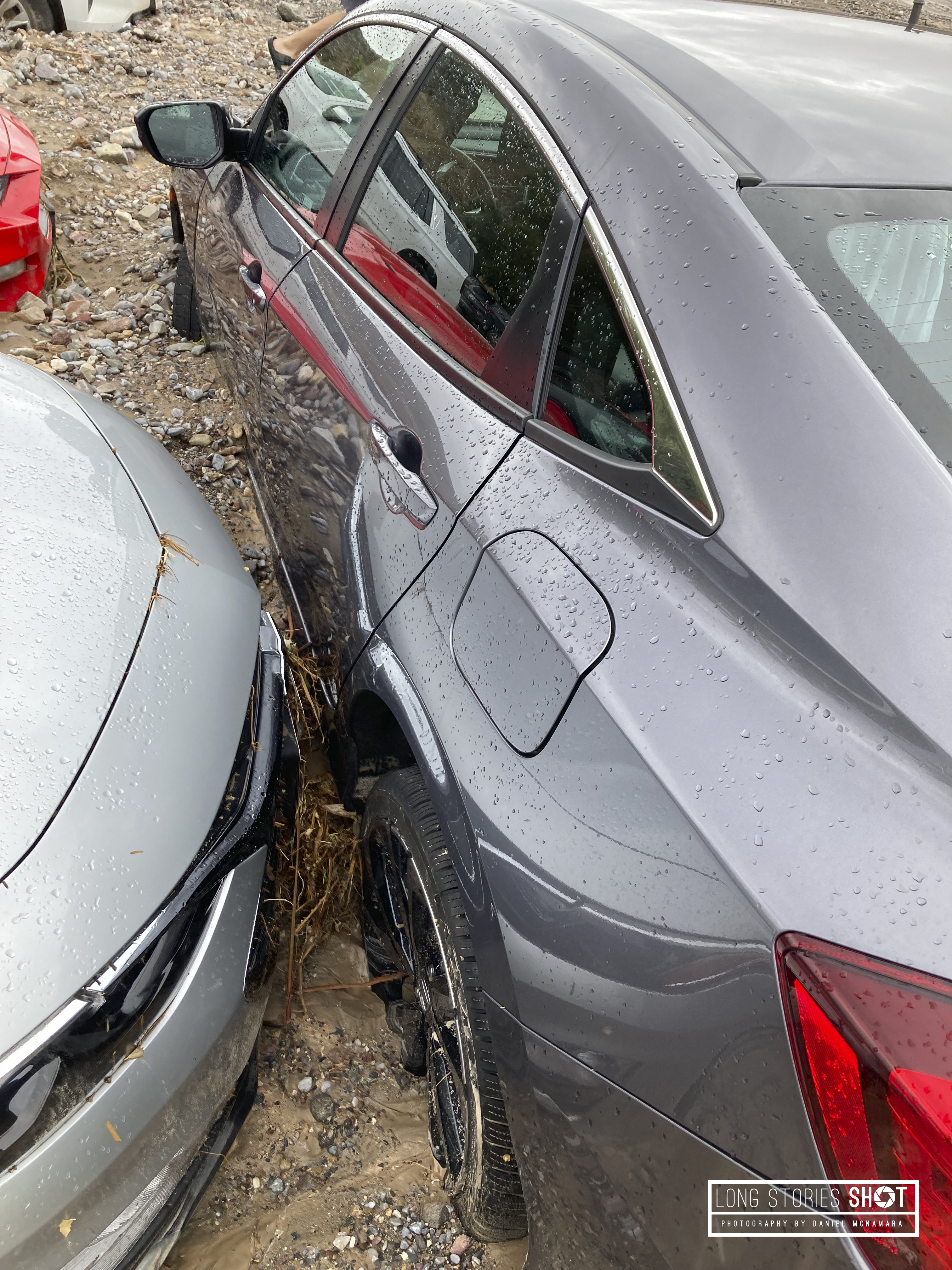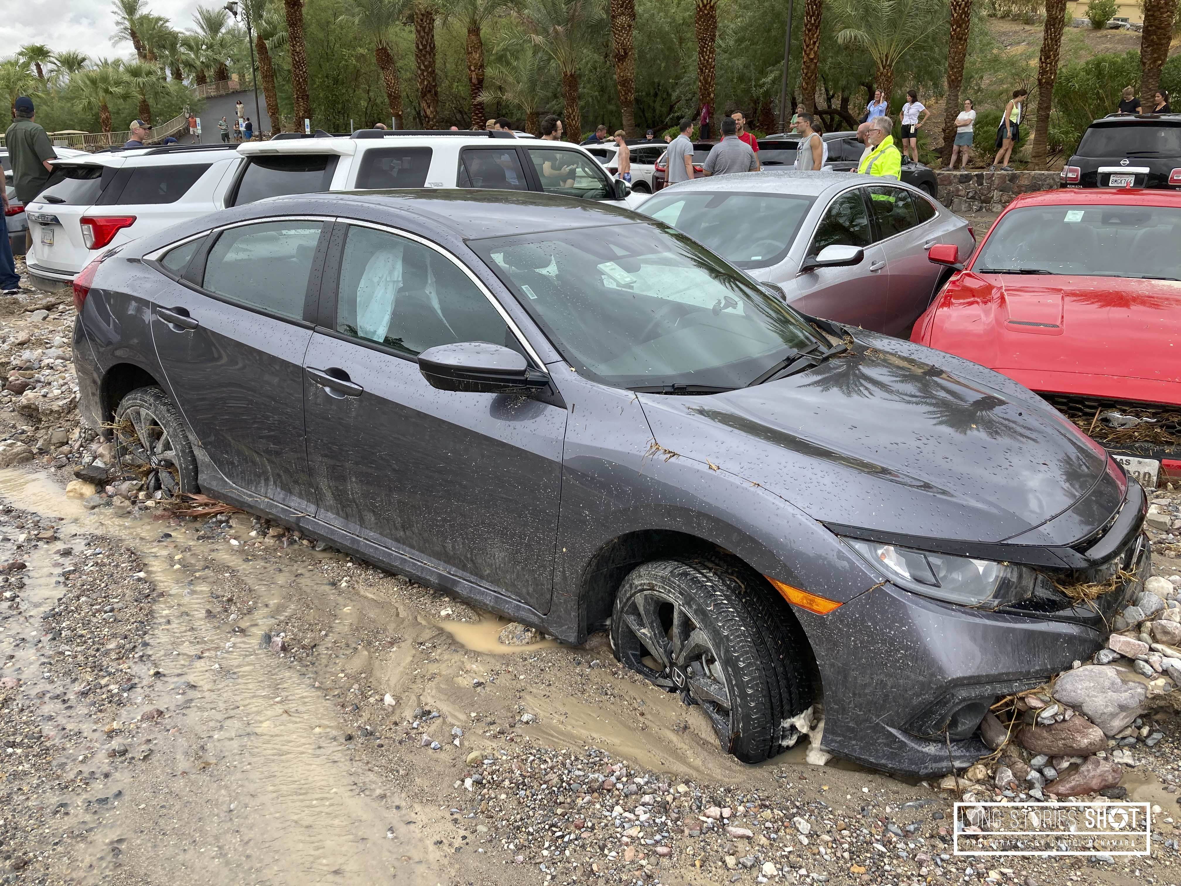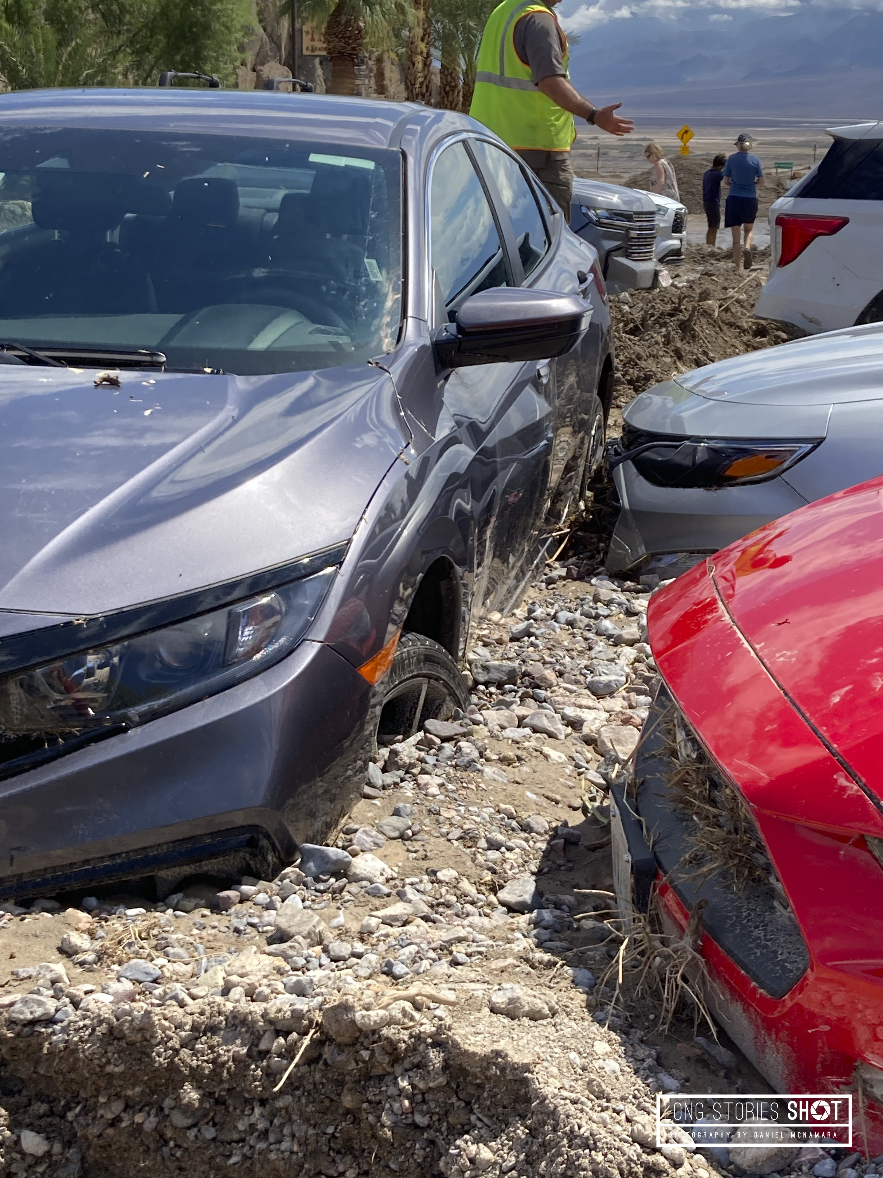 The grey Honda is our hire car. It was parked about 30m up from where it lay and was parked perpendicular to the rest of the cars, I think it took the brunt of the huge mud, rock and water landslide that wiped out the carpark of the hotel. AVIS car hire and The Death Valley Inn were utterly useless in their response with little to no help from either party – highlighting the problems of the suing culture in the US. We ended up having to stay at the hotel for an extra night, unable to go anywhere due to our totalled car and closed roads. I was on hold to AVIS probably for a total of about 15hours before we finally received a replacement car at 7pm the following day. This lost us 2 days of our trip. Many people worked all day to dig their cars out of the mud and water so they could continue their journey – but our was worst hit. The heat would have made me extremely ill and besides, even if I could get the car out – there is no way I was risking becoming subsequently stranded in Death Valley, away from the hotel. I had started the car and it was sounding ropey – either the sump had been destroyed or there was water ingress into the cylinders.
