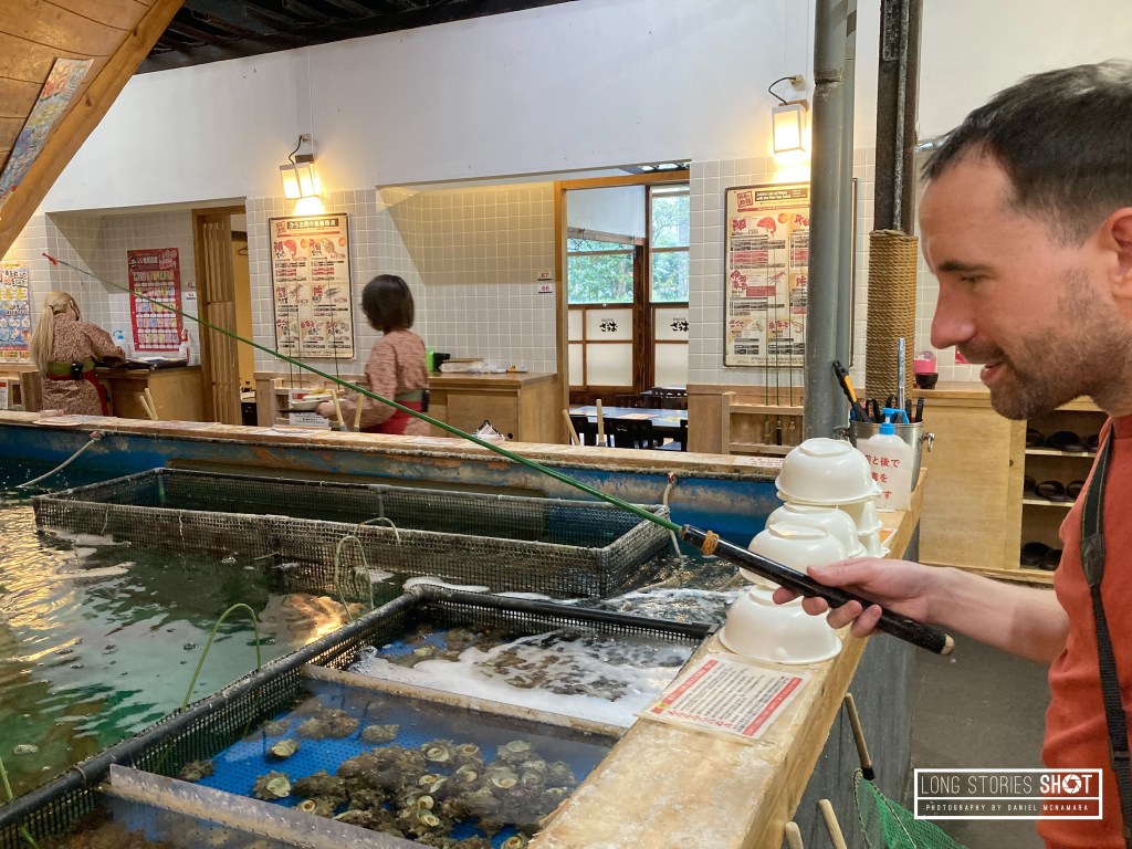 The following day we headed to Zaou in Shinjuku. Zaou is a seafood restaurant in which you have to catch your own fish. The restaurant is on a boat and you take a fishing rod and choose the fish you want to eat for lunch by catching it. I wanted some Horse Mackrel sushi and sashimi… turns out that the Horse Mackrel is a feisty little sea creature and didn’t want to take the bait despite the best efforts of an 8 year old Japanese boy giving me tips! Luckily for me I love prawns and they were a bit easier to catch so we requested them to be cooked tempura style.