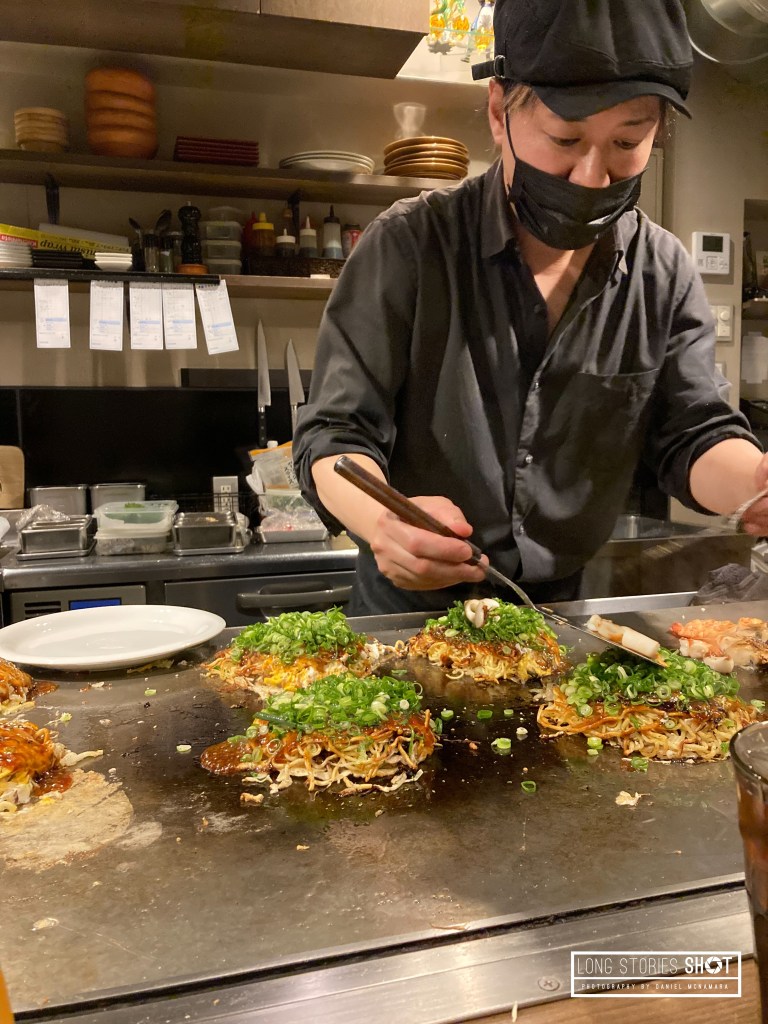 As was the theme of this whole trip we were treated to some incredible food on this leg of our trip. One of our favourites was the Okinomiyaki; a local street food delicacy served at tepanyaki restaurants. Luckily we booked this restaurant a few weeks in advance as quite literally every minute someone was at the door looking for a table. The food was incredible, the service friendly and warm and the spectacle of the preparation was entertainment itself. Okinomiyaki is a pancake topped with noodles, vegetables, meat and egg and okinomiyaki sauce – I opted for the seafood topped pancake and Nadine had mushrooms. This was such a delicious meal!